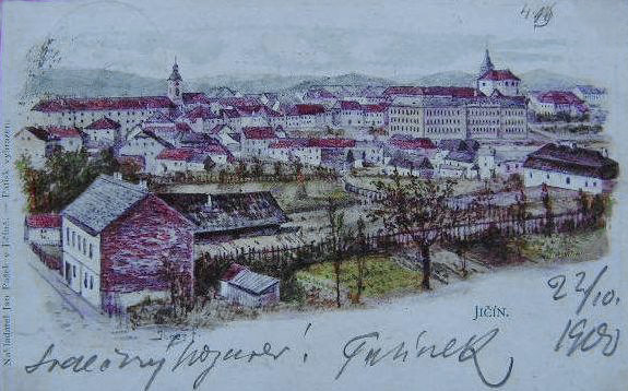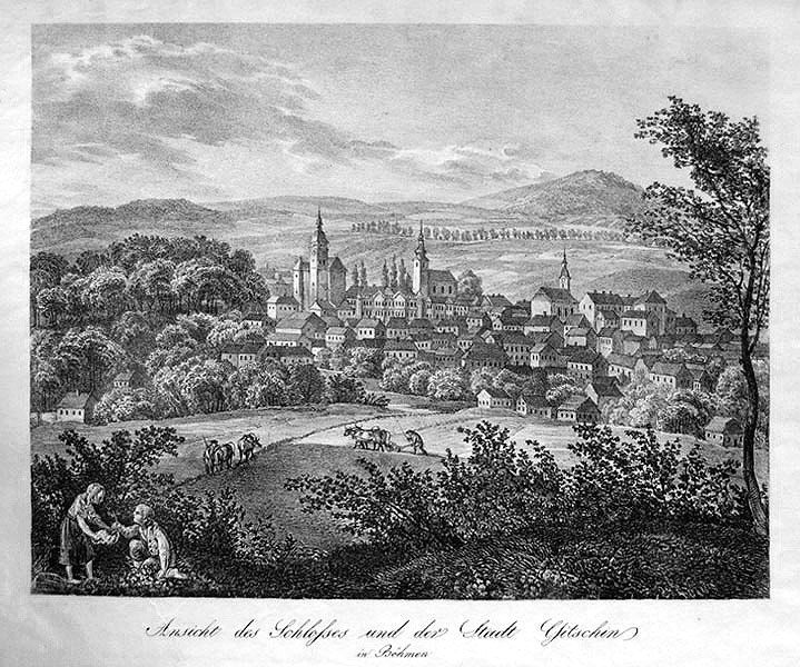 ![]() Adolf Bedřich Kunike: "Ansicht des Schlosses und der Stadt Gitschin"; Steindruck, ca 1820, 248x327mm. |