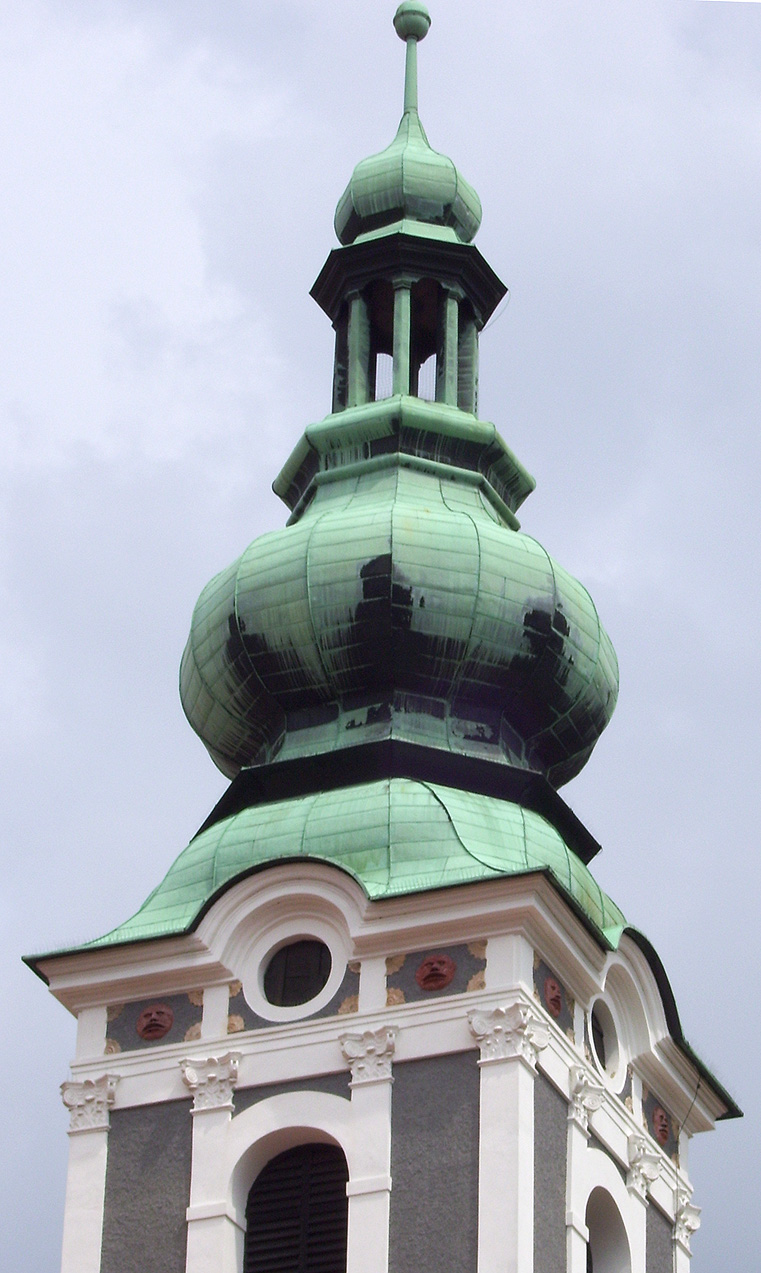 Die Schlosstreppe. Im Mittelpunkte der Stadt die gotische Sankt Veits Dekanatskirche, die 1309 gegründet wurde. Der heutige Bau stammt aus der 1. Hälfte des 15. Jhs., die Inneneinrichtung vor allem aus dem 17. und 18. Jahrhundert. |