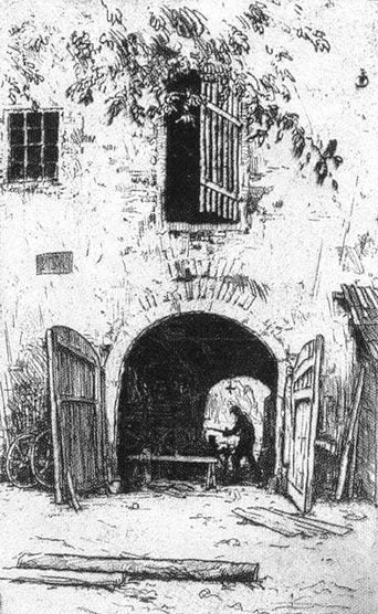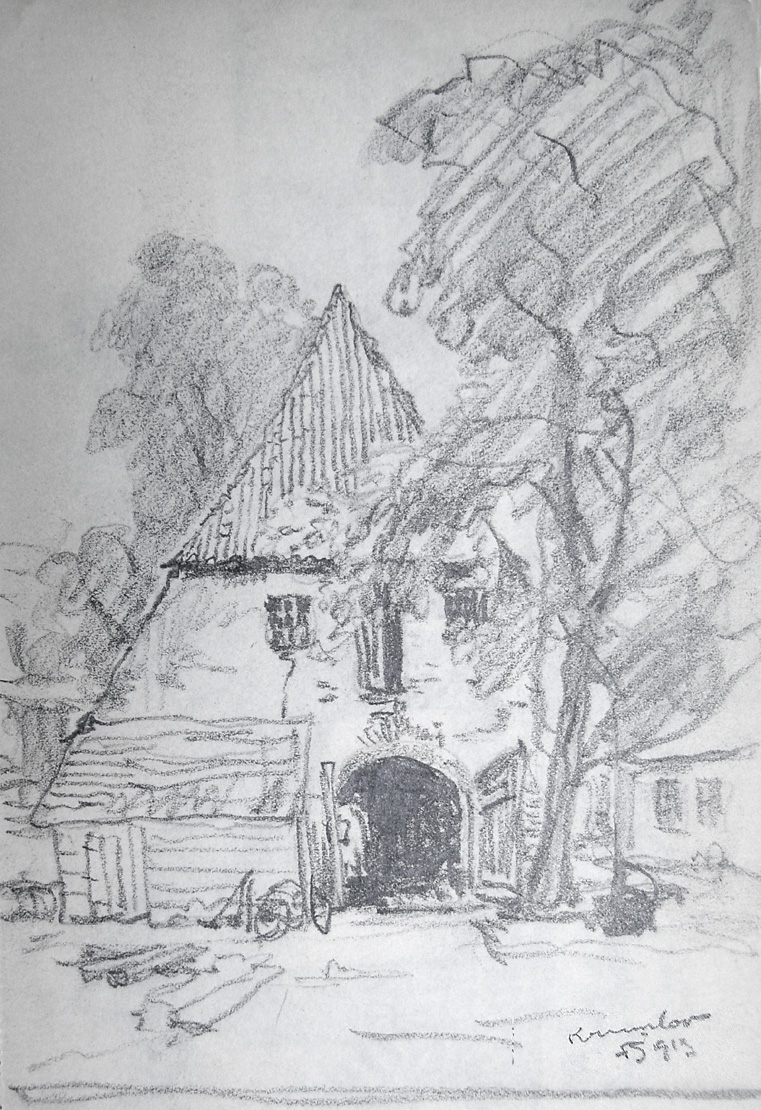 T. F. Šimon: "Krumlov, Das Alte Zughaus",1913 , Bleistift, 18x12,8 cm. |