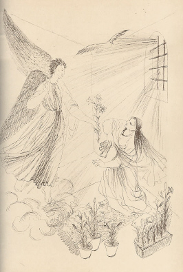 ![]() Marie Vančíková-Želibská: drawing in the book Zahrada Mariánská (The Garden of Mary), by Julius Zeyer. Česká grafická Unie, Prague 1941, original half-cloth binding with original cover, 99 pp., 30x21. |