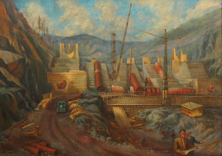![]() Polášek, Viktor: "Construction of the Slapy dam". Oil on canvas, 97 x 136 cm, framed, dated 1952, signed lower right. The subject and conception of this painting is a good quality example of realism. This painter, graphic artist and illustrator is known for his genre subjects and illustrations.