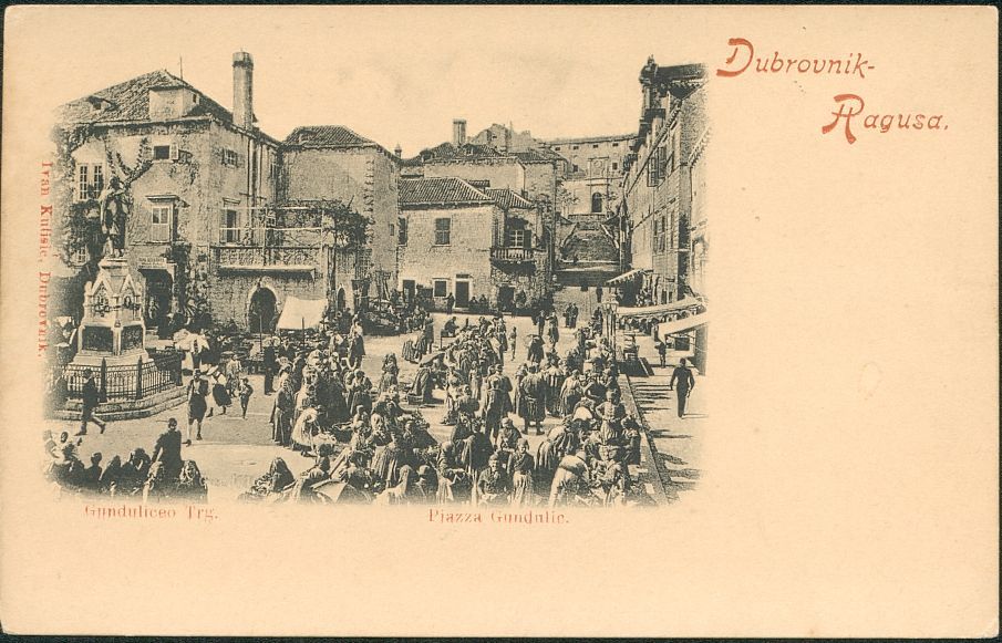 Gundulicea Trg Piazza Gundulic". Left Ivan Kulisic, Dubrovnik. Back: no handwriting. Preprinted "Correspondenz-Karte. Dopisnica Cartolina di corrispondenza.". Left "Nur für die Adresse Za sami nadpis Soltanto per l'indirizzo". |