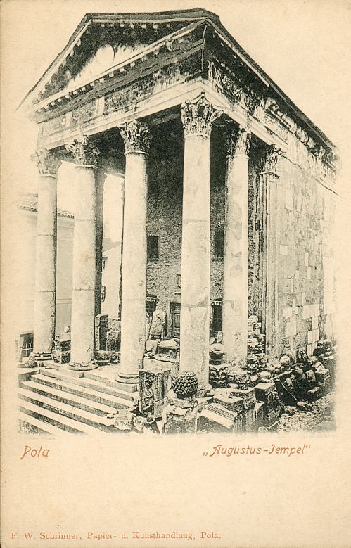 and "F.W. Schrinner, Papier- u. Kunsthandlung, Pola." Back: no handwriting. Preprinted at the top "Correspondenz-Karte. Cartolina di correspondenza." In the middle "An Al" and "in a". Left "Nur für die Adresse" and "Soltanto per l`indurizzo". |