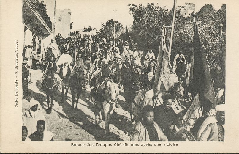 Chérifiennes aprčs une victoire". Left "Collection Idéale - S. Benaďoun, Tanger". Back: no handwriting. Preprinted left "Carte Postale" and "correspondance", right Arab text and "adresse" and the letter "M". |