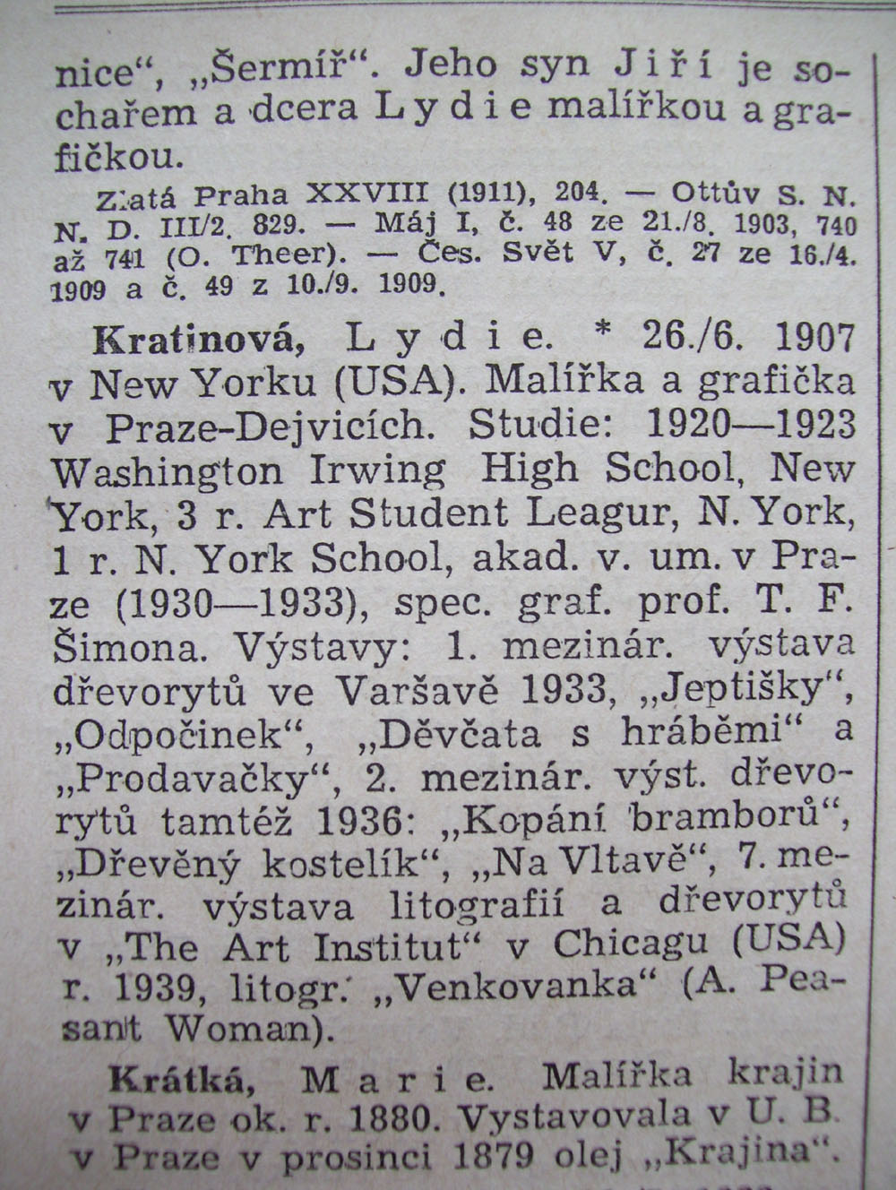 15. Lydia Kratina, * 26.6.1907 New York (USA). She studied at the Art Student League, New York, from 1920 - 1923 at the Washington Irwing High School, New York, and from 1930 - 1933 at the AVU under her uncle T. F. Šimon (she was the daughter of a sister of Vilma, the wife of T. F. Šimon). |