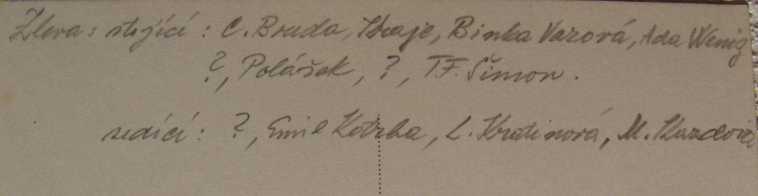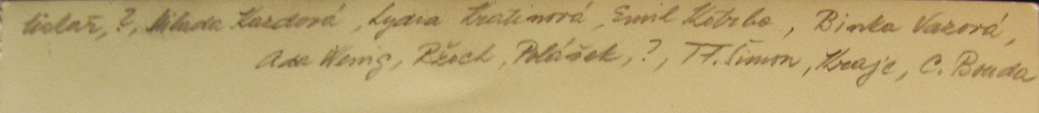 ![]() ![]() ?, ?, ?, Lydia Kratina, Emil Kotrba, Binka Vazova, Adolf Wenig, ?, Victor Polašek, ?, T F Šimon, Krajc(?), Cyril Bouda. |